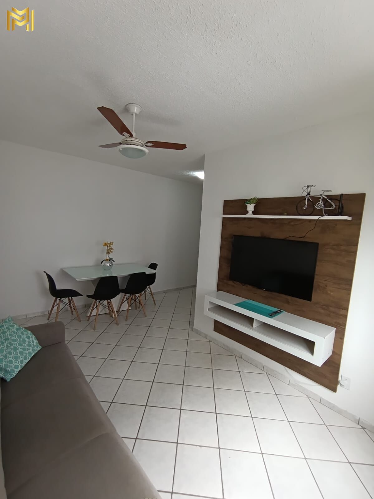Sendo dois quartos com ventilador, um com cama de casal e duas camas de solteiro, banheiro, cozinha, sala com tv 32 polegadas e ventilador, sofá, mesa para quatro cadeiras e uma área de serviço.